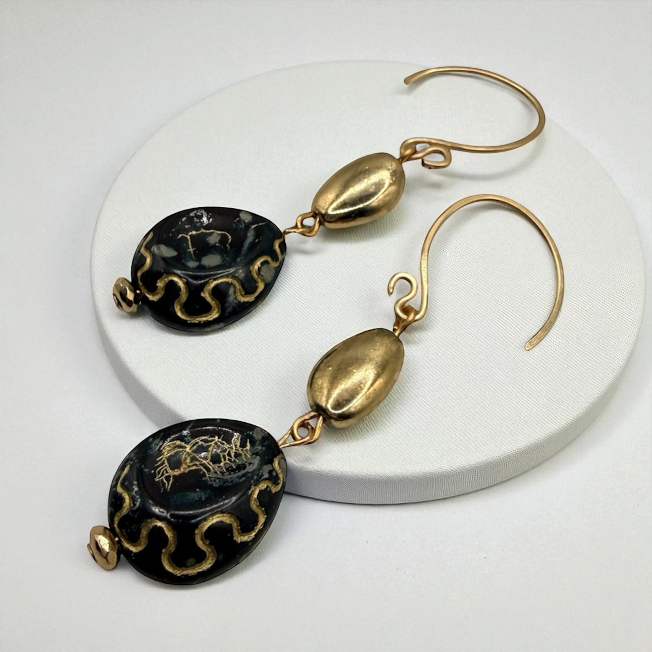 The Amara Earrings exude an air of timeless artistry and quiet confidence. Each earring features a rich, deep stone accented with hand-detailed golden waves, symbolizing movement and grace. The antique gold oval connectors add a touch of warmth and vintage allure, creating a striking balance of bold and elegant.