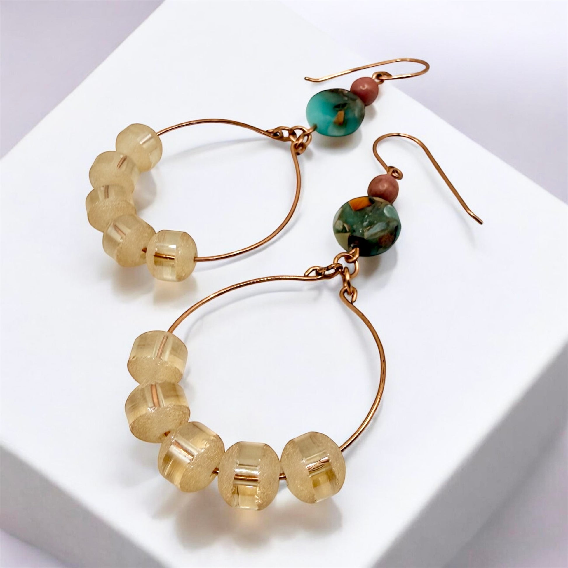 Inspired by nature's warm hues and earthy textures, these handcrafted earrings feature a mix of amber and mauve-toned beads, accented by unique marbled stones.