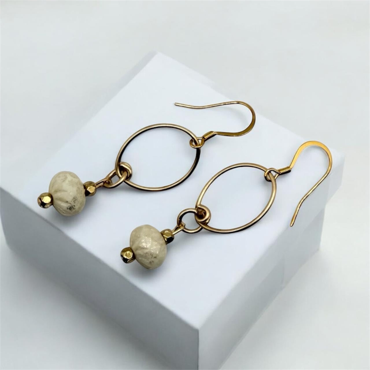 Minimalist elegance with natural charm with a lightweight gold oval frame that creates graceful movement, delicately accented by a neutral stone bead for a soft, earthy touch.