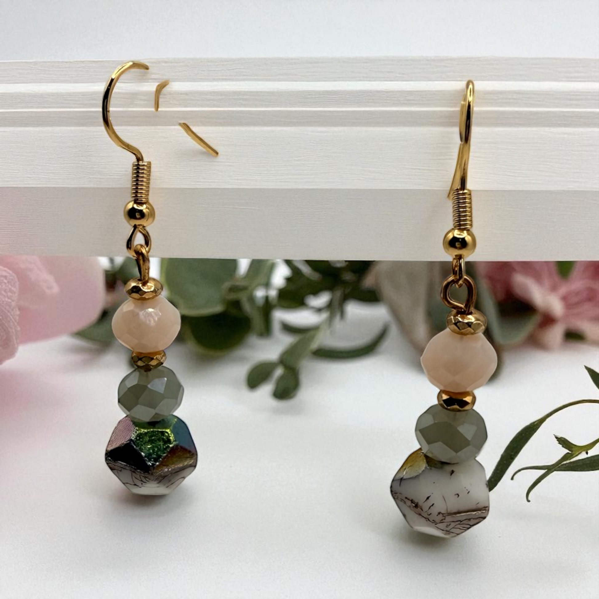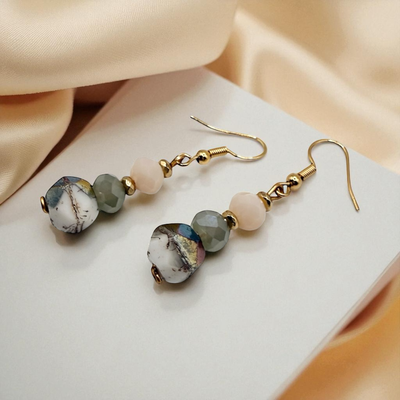 Soft hues and natural elegance for a look that’s effortlessly refined, featuring a delicate mix of faceted cream, sage, and marbled stones, each piece radiates calm sophistication with a hint of warmth from gold accents.