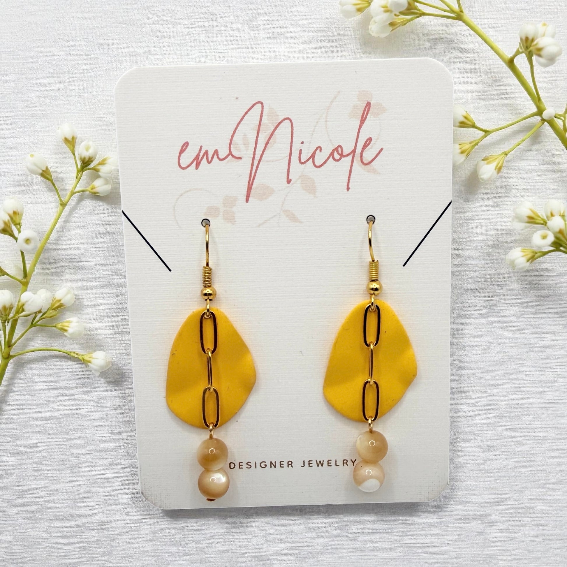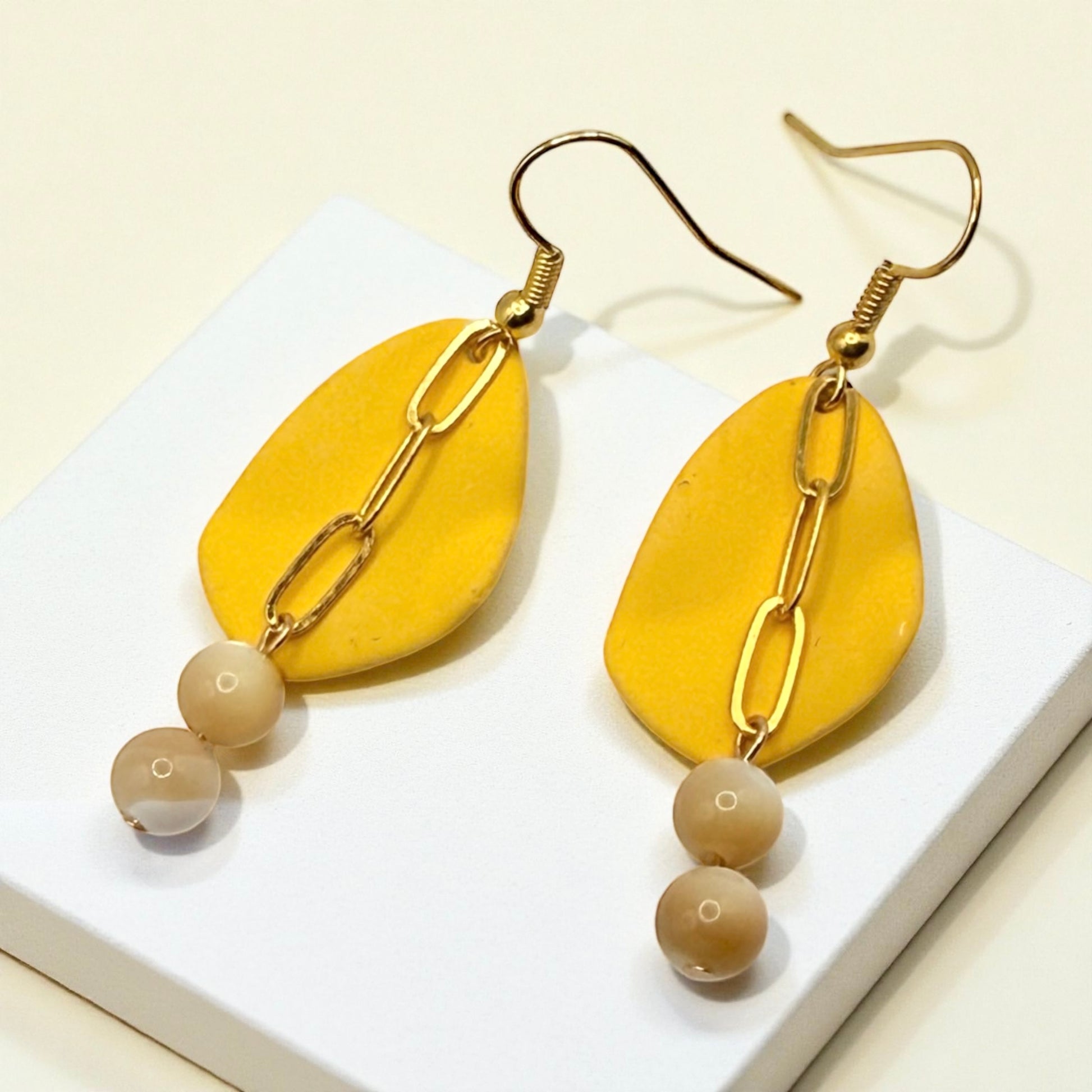 Vibrant golden-yellow drops serve as the bold focal point, complemented by modern gold chain links. Soft, neutral beads complete the design with an airy elegance.