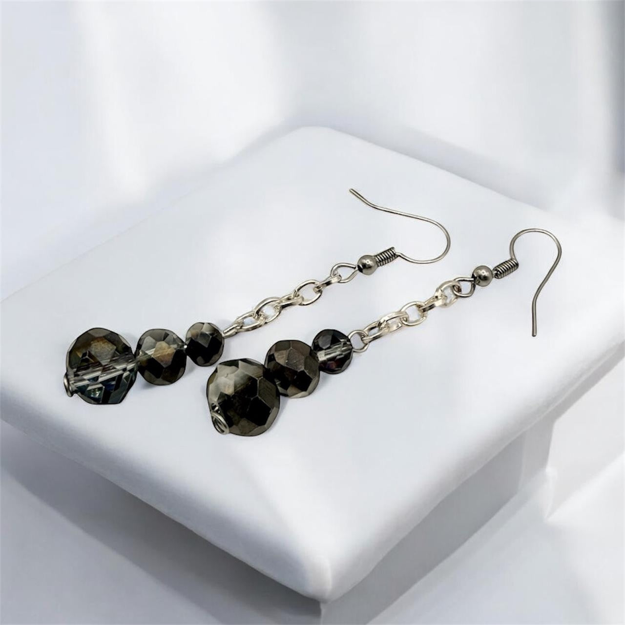 An air of mystique and glamour to any ensemble. Featuring faceted hematite-inspired beads that shimmer with subtle iridescence, these earrings are suspended from delicate silver chains for a touch of movement and elegance.